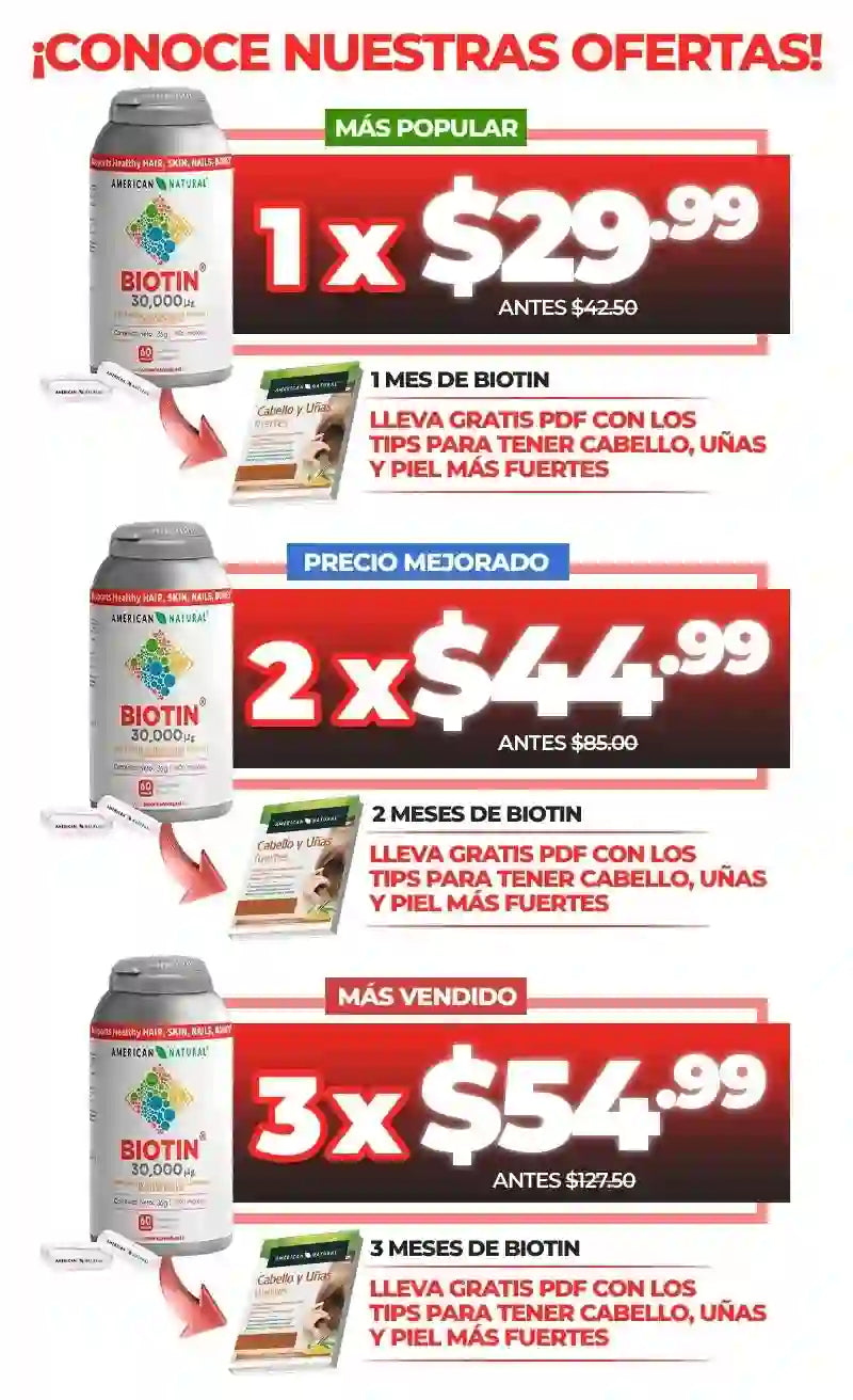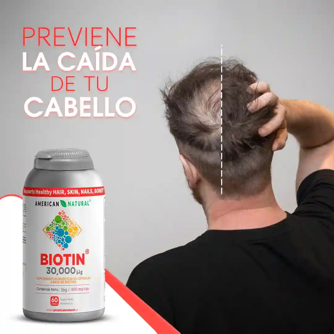 La Biotina es clave para el crecimiento capilar masculino. Esta fórmula de 30,000 µg con vitaminas esenciales
